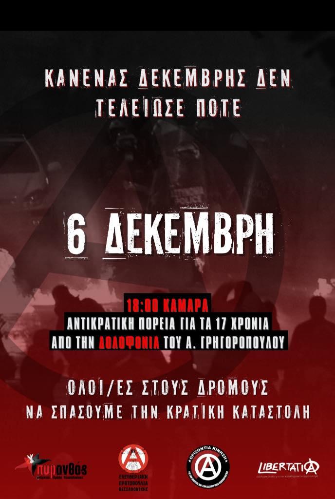 *Διαδηλώνουμε σε κοινό μπλοκ με τους συντρόφους και τις συντρόφισσες από την Οριζόντια Κίνηση – για την Αναρχία και τον Ελευθεριακό Κομμουνισμό, την Ελευθεριακή Πρωτοβουλία Θεσσαλονίκης και την Αναρχική Ομάδα Πυρανθός